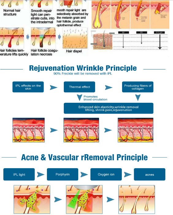IPL (Intense pulsed Light) is a kind of color light with high energy, broad spectrum, various wavelength, which could effectively penetrate epidermis to dermis.This light could reach different layers of skin, and absorbed by targeted tissue, so IPL could successfully kill the hair follicles then remove unwanted hair permnently. It could also close the abnormal blood vessels, effectively treat the telangiectasis. And could decompose abnormal pigment cells, then remove all kinds of spots.
